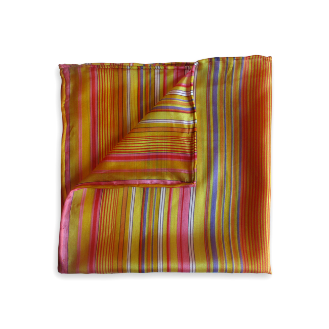 Extravaganza is a luxurious colourful stripes pocket square which is very light as a feather. It will create an exceptionally unique statement when you wear it with a suit. It has a hand rolled edges .